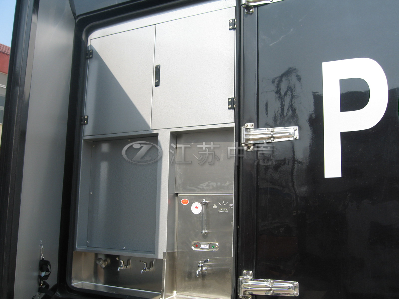 警用装备运输车采用单排带卧铺驾驶室。整车配备多个移动货架模块,可快速移除货架,清空货厢,用于运输其他物资。整车主要配置有:移动货架模块、整车支撑支腿、折叠踏步、枪柜、警灯警报系统、倒车监视及雷达、外部照明系统、车内照明系统等。